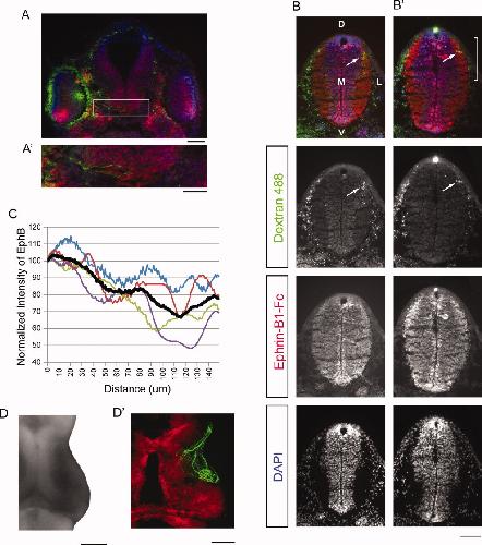 Figure 4 Dorsoventral gradient of EphB expression in young tadpoles. (A) A coronal section of a stage 40/41 tadpole rostral to the tectum shows DAPI (blue), Alexa Fluor 488 dextran iontophoresed into the eye (green) and a high ventral to low dorsal gradient of EphBs in the eyes (red, ephrinâB1âFc). The white box indicates the region magnified in Aâ². (Aâ²) Several labeled retinal axons (green) can be seen traversing the optic chiasm. (B) A coronal section of the brain of a stage 40â41 animal, showing Alexa Fluor 488 dextran (retinal axons, green), ephrinâB1âFc (EphBs, red), and DAPI (cell bodies, blue). Each channel is represented in a separate panel below the composite image, and the terminations of RGC axons in the neuropil are indicated with white arrows. Dorsal (D), ventral (V), medial (M), and lateral (L) axes are labeled. (Bâ²) One section caudal to B (Bâ²) is the most caudal section containing retinal axons. A distinct high dorsal to low ventral gradient of EphBs can be seen across the retinorecipient neuropil (indicated by the white bracket). (C) A graph indicating the EphB reactivity (normalized to the dorsalâmost value) across the dorsalâmost 150 μm of the retinorecipient neuropil as defined by the presence of RGC axon terminals. The black line is the average intensity, and the red line indicates the intensity of the image shown in Bâ². (D,Dâ²) The high caudomedial to low rostrolateral gradient of EphBs across the dorsal surface of the tectum (D) outlines the region of tectal innervation of retinal axons (Dâ²), as seen in two different stage 48 brains. Scale bars: A = 100 μm, Aâ² = 50 μm, B,Bâ²,D,Dâ² = 100 μm. |
