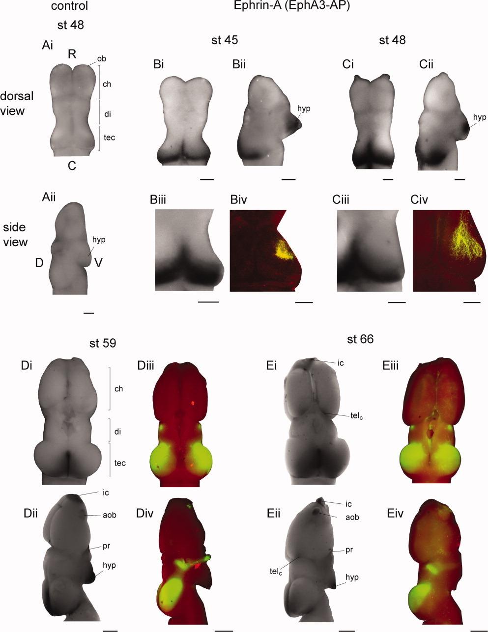 Figure 1. EphrinâA expression. (A) Dorsal (Ai) and side (Aii) views of a stage 48 wholeâmount Xenopus brain reacted with the negative control APâonly probe. The tissue is a pale uniform pink and has no discernible staining pattern. Rostral (R), caudal (C), dorsal (D), and ventral (V) axes are labeled, and this orientation is consistent in all other wholeâmount images. (BâC) Patterns of ephrinâA expression (EphA3âAP binding) in representative stage 45 (B) and 48 (C) brains (dorsal: Bi, Ci, side: Bii, Cii). Additional examples of ephrinâA tectal expression patterns (Biii, Ciii) are shown next to examples of the bulk DiIâlabeled retinal projection (Biv, Civ) in animals of the same ages (RGCs, green; autofluorescence, red). Twoâphoton optical section at stage 45 (Biv) and zâprojection at stage 48 (Civ) highlight the relative location of retinorecipient tectal neuropil. (DâE) EphrinâA expression and retinal innervation pattern in stage 59 (D) and 66 (E) brains; dorsal views are above (Di, Diii, Ei, Eiii), and side views are below (Dii, Div, Eii, Eiv). EphrinâAs are intensely expressed at stage 45 and 48 in the hypothalamus and in a very clear high caudal to low rostral gradient in the tectum. The gradient of tectal ephrinâA expression shifts slightly in late developmental stages to a low rostrolateral to high caudomedial gradient. Throughout development, retinorecipient tectal neuropil is located rostrolateral to the caudal pole of the tectum and to the peak of ephrinâA expression but within the zone of graded ephrinâA expression. Paired dorsal and side view images are of the same brains for AâE except Dii, for which a more representative side view image was chosen. Scale bars: AâC = 100 μm, DâE = 500 μm. aob: accessory olfactory bulb; ch: cerebral hemisphere; di: diencephalon; hyp: hypothalamus; ic: implantation cones of the olfactory bulb; ob: olfactory bulb; pr: preoptic area; tec: tectum; telc: caudal region of the telencephalon. |