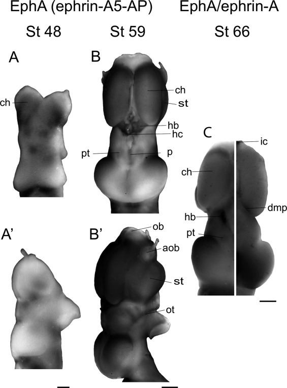 Figure 2. EphA expression. (A,B) Dorsal views of stage 48 (A) and stage 59 (B) brains showing EphA expression. (Aâ²,Bâ²) Side views of the same brains. EphAs are highly expressed throughout development in the cerebral hemispheres. In younger stages, EphAs are expressed in several regions of the diencephalon and faintly in rostral tectum. From stage 59 onward, a strong high rostrolateral to low caudomedial gradient is seen in the tectum. Staining is also present in older stages in the pretectum, striatum, habenular commissure, habenular nuclei, precommissural area, and the optic tract, although is notably absent in the olfactory regions. (C) Composite image showing EphA expression (left) and ephrinâA expression (right) in the stage 66 brain. The complementarity of the gradients of expression of EphAs and ephrinâAs in the tectal lobes is striking. Scale bars: A,Aâ² = 100 μm, BâC = 500 μm. aob: accessory olfactory bulb; ch: cerebral hemisphere; hb: habenular nuclei; hc: habenular commissure; ic: implantation cones of the olfactory bulb; pt: pretectum; ob: olfactory bulb; ot: optic tract; p: precommissural area; st: striatum; telc: caudal region of the telencephalon. |