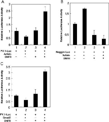 Modulation of activin signaling by DNFR affects the promoter activities of dorsal and ventral molecules. (A, C) The PV.1-luciferases construct (gPV.1, 40 pg) or (B) Noggin-luciferases construct (Noggin, 40 pg) was co-injected with mRNA (2 ng of DNFR or Smad2) into one-cell stage embryos. Animal caps obtained from the embryos (stage 8.5–9) were cultured in the presence (A and B) or absence (C) of activin (25 ng/ml) until stage 13. All values are averages of at least three independent experiments. The data are presented as luciferase activity relative to the average luciferase activity in at least 30 animal caps per each sample.