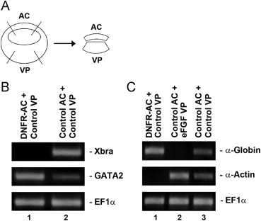 FGF signaling modulates the mesoderm-inducing activity of activin-like signals originating from the endoderm. (A) Tissue recombinant technique. (B and C) At stage 8, animal caps isolated from embryos injected with DNFR (2 ng) or control embryos were recombined with vegetal endoderm from the control embryos or the eFGF (2 ng)-injected embryos. eFGF was injected into the vegetal region of 1-cell stage embryos. The recombinants were cultured until stage 11 or 24. Xbra (pan-mesoderm marker) and GATA2 (ventral mesoderm marker) RT-PCRs at stage 11. α-Globin (late ventral mesoderm and blood marker) and α-Actin (late dorsal mesoderm marker) RT-PCRs at stage 24. AC, animal cap; VP, vegetal pole.