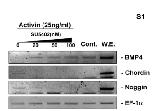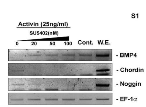 Supplemental Figure 1. Inhibition of FGF enhanced BMP-4 expression repressed by activin. However, the expression level of BMP-4 was not more than those of untreated control animal cap explants. Animal caps were incubated in the combination of the indicated concentration of SU5402 as an inhibitor of FGFR and activin. The primer of BMP-4, chordin and noggin were used for RT-PCR at stage 11. EF-1α, a loading control; Cont, animal cap samples obtained from non-injected embryos; W.E., whole embryo as a positive control.