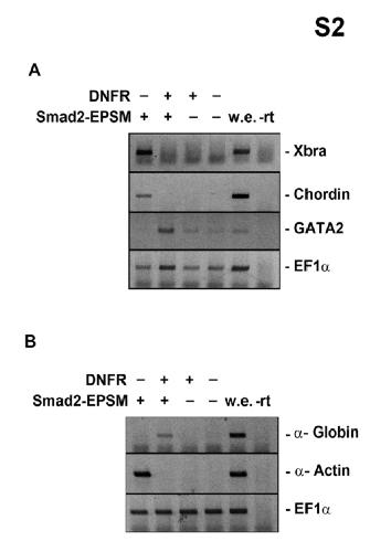 Supplemental Figure 2. The Smad2 mutant that abolished the phosphorylation sites by FGF signaling, Smad2-EPSM, does not induce ventral mesoderm in animal cap cells. (A & B) RT-PCR analysis in animal caps expressing indicated mRNAs. (A) The primer of Xbra (pan-mesoderm marker), chordin (dorsal mesoderm marker) and GATA2 (ventral mesoderm marker) were used for RT-PCR at stage 11. (B) The primer of globin (later ventral mesoderm and blood marker) and actin (later dorsal mesoderm marker) were used for PCR at stage 24. EF-1α, a loading control; -rt, control reaction without reverse transcriptase; cont, animal cap samples obtained from non-injected embryos; we, whole embryo as a positive control.