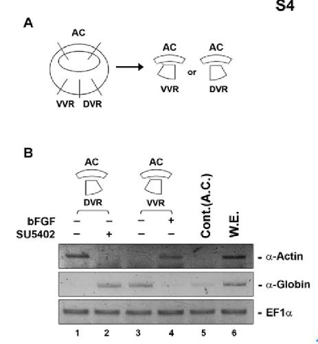 Supplemental Figure 4. We tested the fate of conjugates between animal caps and dorsal or ventral vegetal region at the conditions in the presence or absence of FGF signaling by using of SU5402 (FGF receptor blocker) and bFGF protein. The animal caps were conjugated with dorsal vegetal region (DVR) as an inducer of activin-like signal and incubated in the solution containing SU5402 (50 μM/㎖) until stage 24. Conjugates between animal caps and ventral vegetal region (VVR) were incubated in the presence of bFGF (20 ng/㎖). (A) Tissue recombinant technique. (B) Gene expression was analyzed by RT-PCR. The primer of α-Globin (later ventral mesoderm and blood marker) and α-Actin (later dorsal mesoderm marker) were used for RT-PCR at stage 24. AC, animal cap; DVR, dorsal vegetal region; VVR, ventral vegetal region.