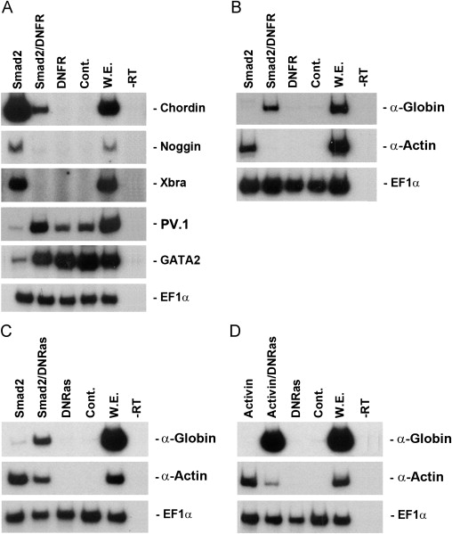 Activin-mediated dorsal mesoderm is converted to ventral mesoderm in DNFR-injected animal cap explants. RT-PCR analysis of activin treated animal cap cells at stage 11 (A) and stage 24 (B). RT-PCR analysis of DNFR-injected animal cap cells incubated either in the presence or absence of activin (25 ng/ml) at stage 11 (C) and stage 24 (D). EF-1α, loading control; -rt, control reaction without reverse transcriptase; we, whole embryo positive control; pan-mesoderm marker, Xbra; dorsal mesoderm markers, chordin and noggin; ventral specific markers, PV.1 and GATA2; late dorsal mesoderm marker, α-Actin; later ventral mesoderm marker, α-Globin; endoderm marker, Edd.