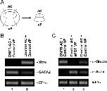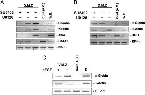 Inhibition of FGF signaling in the dorsal marginal zone converts the dorsal mesoderm to ventral mesoderm. At stage 10, dorsal marginal zones (DMZs) isolated from embryos were treated with FGF receptor inhibitor, SU5402 (50 μM), and Erk inhibitor, U0126 (50 μM) until stages 11 (A) and 24 (B). (C) At stage 10, ventral marginal zones (VMZs) isolated from eFGF-injected embryos or control embryos were cultured until stage 24. Xbra (pan-mesoderm marker), Chordin/Noggin (dorsal mesoderm marker) and GATA2 (ventral mesoderm marker) RT-PCRs at stage 11(A). α-Globin (later ventral mesoderm and blood marker), α-Actin (late dorsal mesoderm marker) and Xk81 (late epidermis marker) RT-PCRs at stage 24 (B & C). EF-1α, loading control; Cont. (A.C.), animal cap samples obtained from non-injected embryos; WE, whole embryo positive control.