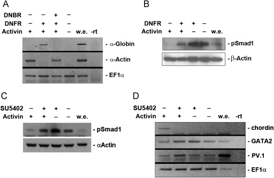 The expression of dominant-negative BMP-4 receptor blocks globin expression induced by activin and DNFR, and the inhibition of Smad1 (via activin), was recovered by inhibition of FGF signaling. Animal cap explants injected with 2 ng of DNFR and/or 2 ng of dominant-negative BMP-4 receptor (DNBR) were dissected and incubated in activin (25 ng/ml) until stage 24 (A). (B and C) Animal cap cells expressing mRNA (1 ng) or activin (25 ng/ml) were used for western blot (B and C) or RT-PCR. (D) Chordin (dorsal mesoderm marker) and PV.1/GATA2 (ventral mesoderm marker) PCRs at stage 11. α-Globin (late ventral mesoderm and blood marker) and α-Actin (late dorsal mesoderm marker) RT-PCRs at stage 24. EF-1α, loading control; -rt, control reaction without reverse transcriptase; cont, animal cap samples obtained from non-injected embryos; we, whole embryo positive control.