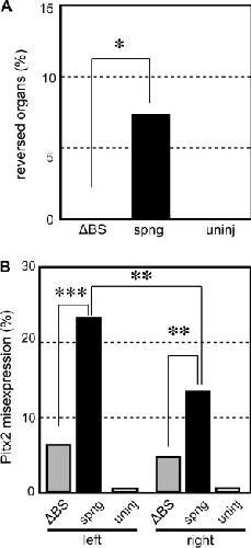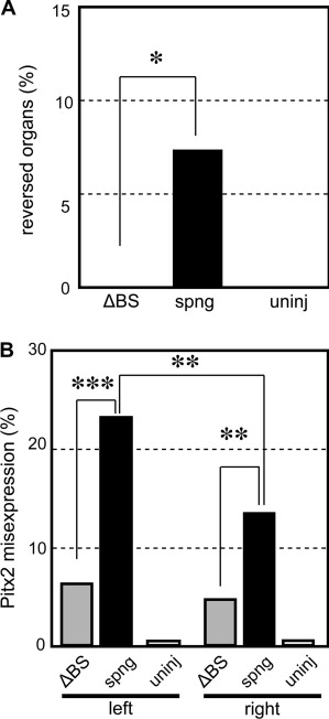 IP3 competitive inhibition by IP3 sponge injection. (A) Percentages of reversed organs in Xenopus embryos injected with IP3 sponge RNA. Control embryos (uninj or δBS) had no organ reversal, but IP3 sponge RNA-injected embryos (spng) had a significantly greater percentage of reversed organs than in δBS RNA-injected embryos. n > 75 for each group. (B) Percentages of Pitx2 misexpression (see text for definition). Embryos were injected with δBS or IP3 sponge RNA (δBS or spng) on one side or acted as uninjected controls (uninj). Left and right side injection of the IP3 sponge randomized Pitx2 expression, which was significantly higher than in embryo injected with δBS RNA. n > 165 for each group. âP < 0.05; ââP < 0.005; âââP < 5 à 10â6, chi-square test.