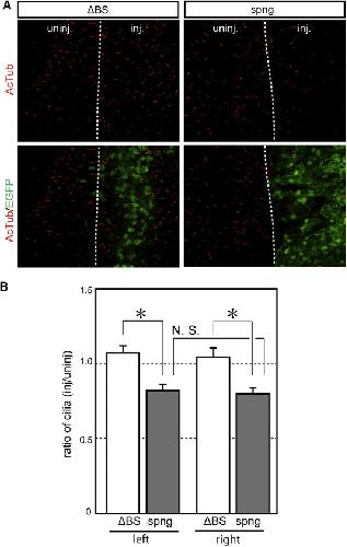 Abundance of GRP cilia is reduced by IP3 sponge RNA. (A) Representative images of gastrocoel roof plate (GRP) cilia in δBS or IP3 sponge (spng) RNA-injected Xenopus embryos. Injection side was determined by fluorescence from co-expressed enhanced green fluorescent protein (EGFP). Cilia in the GRP adjacent to the blastopore were counted. Green, EGFP; red, acetylated tubulin (AcTub); dotted line, midline; top, anterior: left side of image is left side of embryo. (B) Quantification of GRP cilia. The number of cilia on the injected side was expressed as a ratio of the number on the uninjected (opposite) side (i.e., number of red signals in inj./that in uninj. in A). Normal embryos showed symmetric distribution of GRP cilia [18], and δBS RNA-injected embryos showed nearly symmetrical distribution. IP3 sponge RNA-injected embryos had fewer cilia on the injected side. n = 18â25 for each group. âP < 0.0001 by MannâWhitney U-test.