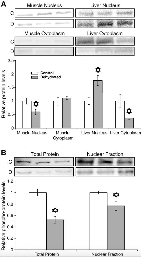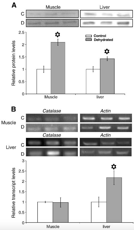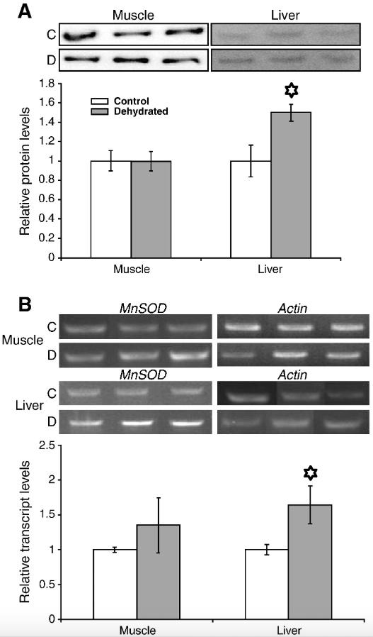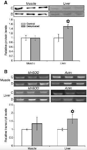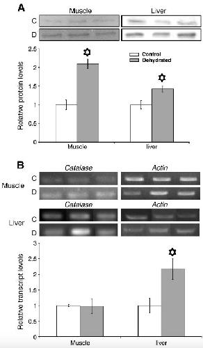 Antioxidant defenses are an important part of adaptation to environmental stress for many organisms. This study analyzed responses to dehydration stress by manganese-dependent superoxide dismutase (MnSOD) and catalase, and the role of forkhead box class O type 1 (FoxO1) transcription factor in regulating their up-regulation, in selected tissues of the African clawed frogs, Xenopus laevis. Protein and mRNA levels of MnSOD and catalase were analyzed by immunoblotting and PCR. Analysis of FoxO1 included protein and phosphoprotein (FoxO1(ser245)) levels, nuclear versus cytoplasmic distribution, and FoxO1 binding to DNA. MnSOD protein increased significantly in the liver during dehydration whereas catalase rose in the liver and skeletal muscle. This was supported in liver by 1.5-2.2 fold increases in MnSOD and catalase mRNA levels. FoxO1 transcriptional activity was enhanced in liver of dehydrated versus control frogs as evidenced by: (a) 1.8-fold increase in FoxO1 protein in the nucleus, (b) strong decreases in inactive phosphorylated FoxO1(ser245) in total and nuclear extracts, and (c) a 57% increase in FoxO1 binding to DNA in nuclear extracts. The study documents up-regulation of MnSOD and catalase in frog organs during dehydration and indicates a role for FoxO1 in controlling expression of these genes in liver. Dehydration-rehydration has components of an ischemia-reperfusion event and the oxidative stress that this generates appears to be effectively addressed, at least in X. laevis liver, by enhanced production of antioxidant enzymes under FoxO1 regulation.