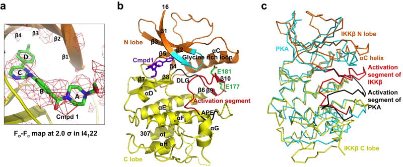 Figure 2. Inhibitor bound xIKKβ kinase domain (KD)a, Fo-Fc electron density map for Cmpd1 in the I4122 structure, contoured at 2.0 σ. Carbon, nitrogen and oxygen atoms are shown in green, blue and red, respectively. b, Structure of xIKKβ KD. Glycine-rich loop: cyan; activation segment: red except that the DLG and APE motifs are in black; Cmpd1: purple. Side chains of phosphomimic residues E177 and E181 are shown. c, Superposition between xIKKβ (orange and yellow) and PKA (cyan, PDB code 1ATP). The activation segments of xIKKβ and PKA are shown in red and black, respectively.