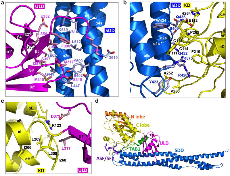 Figure 3. Interactions among the KD, the ULD and the SDDa, Interaction between ULD (magenta) and SDD (blue). Important interfacial side chains are shown with nitrogen atoms in blue, oxygen atoms in red, sulfur atoms in orange, and carbon atoms in either pink (for ULD) or light blue (for SDD). Location of G358 is marked with a black ball on the main chain. b, Interaction between KD (yellow) and SDD (blue). c, Interaction between KD (yellow) and ULD (magenta). d, Locations of the TAB1 peptide (green ribbon, PDB code 2EVA) and the ASF/SF2 peptide (purple stick model, PDB code 1WBP) relative to the IKKβ structure after superposition of the corresponding kinase domains.