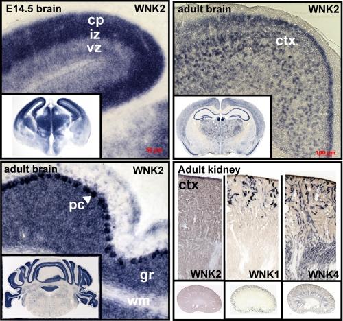 FIGURE 1. Analysis of WNK2 mRNA expression in mouse brain and kidney as compared with other WNK kinases. WNK2 localization (blue) by in situ hybridization shows a high level of expression in mouse brain both in embryonic development (E14.5) and in the adult (top two panels). A representative coronal section of the E14.5 brain (top left) is compared with sections of the adult brain (top right). Whole sections are shown in the inset on top of representative magnified region of the cortex. WNK2 is highly expressed in post-mitotic neurons in the cortical plate (CP) and intermediate zone (IZ) at E14.5. WNK2 is expressed in all cortical layers in the adult cortex (ctx) (top right). WNK2 expression in the adult cerebellum (bottom left). A whole section is shown in the inset on top of a magnified region of the cerebellum. Purkinje cells (pjk), the granular cell layer (gr), and the white matter (wm) are indicated. WNK2, WNK1, and WNK4 mRNA expression in the mouse kidney (bottom right). A whole sagittal section is shown in the insets below images of a magnified region of the cortex (ctx) for each WNK kinase indicated.