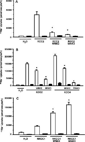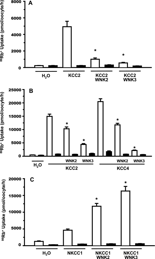 FIGURE 3. Modulation of KCC2, KCC4, and NKCC1 activity by WNK2. Xenopus laevis oocytes were injected with (A) water or 10 ng/oocyte of KCC2 cRNA, (B) water or 10 ng/oocyte of KCC2 or KCC4 cRNA, and (C) water, or 10 ng/oocyte of NKCC1 cRNA. In all figures, cotransporters cRNA were injected alone or together with 10 ng/oocyte of WNK2 or WNK3 cRNA, as stated. Four days later, 86Rb+ influx experiments were performed in isotonic (A and C) or hypotonic conditions (B) in the presence (open bars) or absence (closed bars) of extracellular chloride (A and B) or in the absence (open bars) or presence (closed bars) of 100 μm bumetanide (C). *, significantly different from the uptake observed in corresponding control. Each figure depicts combined data of at least three different experiments.