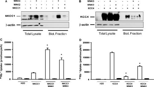FIGURE 4. Effect of WNK2 and WNK3 on the protein level and surface expression of NKCC1 and KCC4. Western blot analysis of the total and biotinylated fraction of proteins extracted from oocytes injected with NKCC1 (A) or KCC4 (B) cRNA in the absence or presence of WNK2 or WNK3 cRNA. C and D depict the results of the functional expression performed the same day using oocytes from the same batch for NKCC1 or KCC4, respectively, expressed as bumetanide-sensitive (C) or chloride-dependent (D) 86Rb+ uptake.