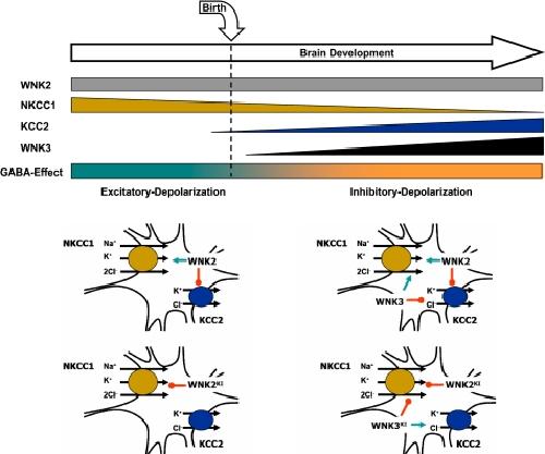 FIGURE 7. Relationship between GABA excitatory and inhibitory effect and the expression of WNK2, WNK3, NKCC1, and KCC2 in the CNS from embryonic to postnatal life.