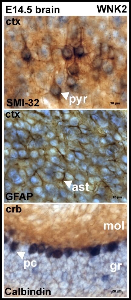 FIGURE 2. Characterization of WNK2-expressing cells in mouse brain. SMI-32 co-localization (brown) highlights WNK2 expression in pyramidal neurons (pyr) in the developing neocortex (top panel). GFAP-expressing astrocytes do not express Wnk2 (middle). The arrowhead marks an astrocyte (ast). WNK2 mRNA is expressed in the Purkinje cells (pc) in the cerebellum, labeled with calbindin (bottom). The molecular layer (mol) and granular layer (gr) border the Purkinje cell layer in the cerebellum.