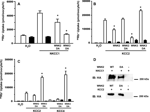 FIGURE 5. Effect of kinase-dead (DA) WNK2 upon NKCC1 and KCCs cotransporters activity. A, 86Rb+ uptake in oocytes injected with water, NKCC1 cRNA alone or together with WNK2-DA or WNK3-DA cRNA. Uptake was performed in isotonic conditions in the absence (open bars) or presence (closed bars) of 100 μm bumetanide. *, significantly different from the uptake observed in NKCC1 cRNA group. B, oocytes were injected with water, KCC2 cRNA alone or together with kinase-dead WNK2 or WNK3, as stated. C, oocytes were injected with water, KCC2, or KCC4 cRNA alone or together with kinase-dead WNK2 or WNK3, as stated. 86Rb+ Uptake was performed in in the presence (open bars) or absence (closed bars) of extracellular Cl−, in hypotonic (B) or isotonic (C) conditions. *, significantly different from the uptake observed in corresponding control. D, representative Western blot analysis of protein homogenates extracted from oocytes injected with wild type or kinase-dead HA-WNK2 cRNA, together with NKCC1 or KCC2 cRNA, as stated. Western blots were then performed using anti-HA monoclonal antibodies. Similar results were observed in the absence of NKCC1 cRNA injections.