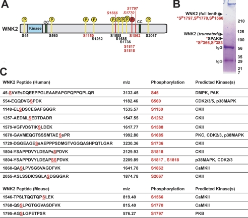 FIGURE 6. MS/MS analysis of WNK2 phosphorylation. A, phosphorylation sites are shown in the context of full-length human WNK2. The conserved kinase domain and two coiled-coiled regions are labeled. Phosphorylation sites identified in human WNK2 expressed in HEK cells are numbered on the bottom of the diagram. Sites unique to this study are in black, and sites in common with other studies are in red. Phosphorylation sites identified in native mouse WNK2 are numbered according to their position in the mouse sequence and mapped onto the corresponding position in human WNK2. Phosphorylation at Ser-1770 (mouse) and Ser-1862 (human) are homologous. B, SDS-PAGE analyisis of native WNK2 immunoprecipitates prepared from mouse brain for MS/MS. An example gel is shown with the results of the MS/MS analysis for each protein band shown to the left. Phosphorylation sites from full-length WNK2 and SPAK identified by MS/MS are listed (for additional peptide information see supplemental Tables S1 and S2. A brief Coomassie-staining method was used to reveal the proteins bands to the naked eye. Bands that were unique to brain IP and not visible in a control IP from mouse kidney (not shown) were cut and subjected to MS analysis. C, table of WNK2 phosphopeptides identified in MS/MS analysis of purified human and mouse WNK2. Mascot searches followed by manual MS/MS spectra interpretation places the possible phosphorylation site within each peptide. Unambiguous assignment of phosphorylation sites are indicated in underlined, red capital S, while ambiguous assignments have the second most likely site as a lowercase s. Kinase motifs corresponding to each phosphorylation site were identified with NetworKIN and NetPhorest analysis. Abbreviations are for Rho-associated protein kinase 1 (DMPK), cAMP-dependent protein kinase (PKA), casein kinase II (CKII), PKC protein kinase CΔ (PKC), p21-activated kinase (PAK), p38 mitogen-activated protein kinase (p38MAPK), and cyclin-dependent kinases (CDK2, 3, and 5).