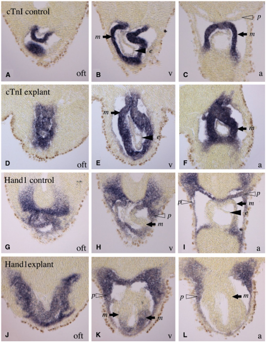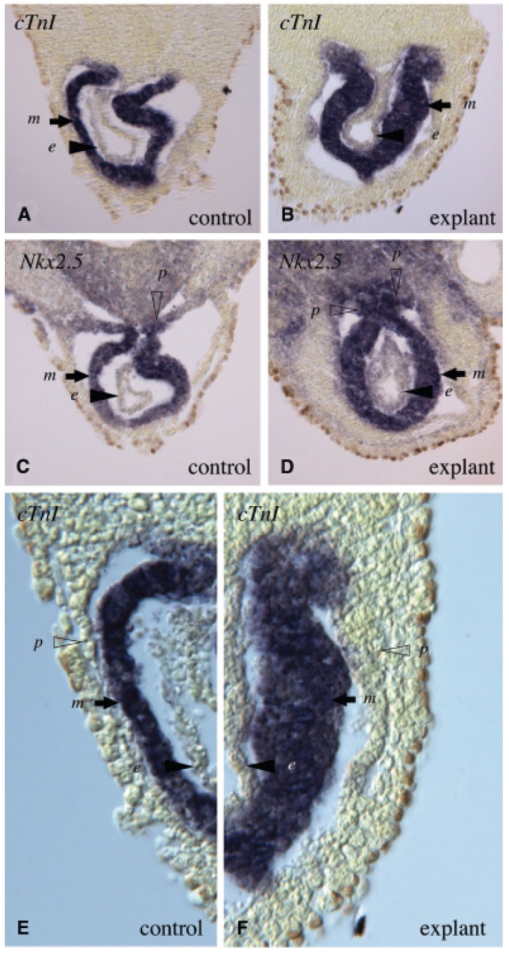enlarged view of embryos (E) and explants (F) stained for cTnI