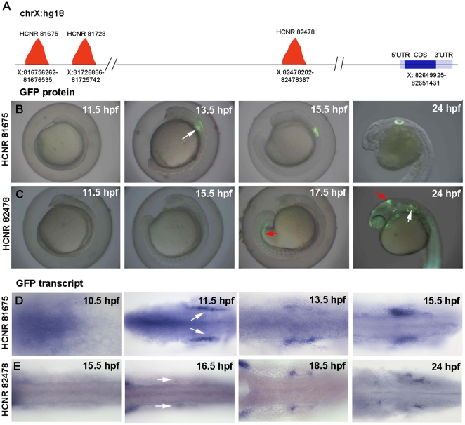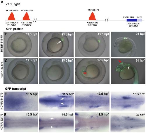 Figure 1. Temporal expression pattern of GFP driven by pou3f4 HCNR 81675 and HCRN 82478 enhancers.(A) Schematic representation of the POU3F4 locus in the human chromosome X (hg18 alignment) showing the position of the different inner ear enhancers relative to the POU3F4 coding sequence. (B–C) Onset of GFP protein expression in HCNR 81675 (B) and HCNR 82478 (C) transgenic embryos. Expression in the otic territory occurs at 13.5 hpf in HCNR 81675 and at 18.5 hpf in HCNR 82478 zebrafish embryos (white arrows), GFP in mesonephros and midbrain-hindbrain boundary (red arrows) is also detected in HCNR 82478 embryos. (D–E) Dorsal views of HCNR 81675 (D) and HCNR 82478 (E) transgenic embryos assayed by in-situ hybridization for GFP mRNA expression. In both cases GFP mRNA was detected in the otic field 2 hours before GFP protein was found (B–C). Orientation of the embryos is anterior (left) to posterior (right).