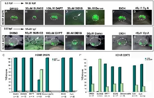 Figure 3. Distinct signaling pathways regulate activation of pou3f4 HCNR 81675 and HCNR 82478 enhancers.(A–N) Transgenic embryos for both enhancers were treated with different pharmacological inhibitors from 5.5 hpf stage to 18–20 hpf and 7.5 hpf to 36–40 hpf respectively. Lateral view of HCNR 81675 (A–G) 18–20 hpf staged otic vesicles and HCNR 82478 (F–N) otic vesicles of 36–40 hpf embryos. HCNR 81675 activity was abrogated in the presence of RA signaling inhibitor DEAB (compare D to the control treatment with DMSO in A), whereas Fgf signaling inhibition by SU5402 completely disrupted pou3f4 HCNR 82478 activity (compare I to control treatment in H). Orientation is anterior (left) to posterior (right). (O, P) Graphs representing the percentage of embryos displaying complete inhibition of GFP expression in pou3f4 HCNR 81675 (O) and HCNR 82478 (P) transgenic embryos after specific signaling pathway blockade. The total number of embryos counted in three independent experiments is represented.
