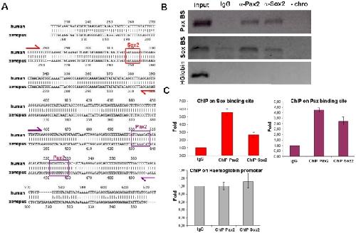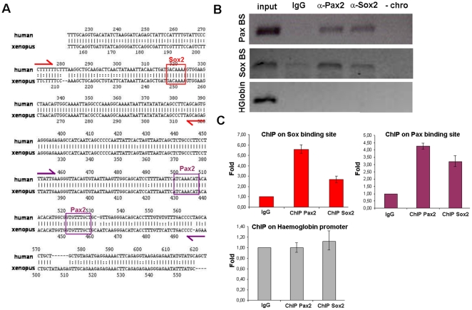 Figure 6. Pax2 and Sox2 are directly recruited to the HCNR 81675 DNA.(A) rVista 2.0 alignment of HCNR 81675 human and Xenopus genomic sequence. Conserved binding sites for Sox and Pax2/5/8 proteins found by TRANSFAC are represented. Primer location enclosing the genomic region of Sox and Pax2/5/8 binding sites designed for chromatin immunoprecipitation are marked with red and violet arrows respectively. (B) ChIP with anti-Pax2 and anti-Sox2 antibodies from stage 30–34 Xenopus otic vesicles was performed and the PCR amplification of the DNA fragments pulled down by Pax2 and Sox2 chromatin immunoprecipitation is shown. A region of the haemoglobin locus with no Pax2 and Sox2 binding sites shows no immunoprecipitation with these antibodies. (C) Graphs representing the relative fold enrichment of Sox2 and Pax2 binding to the HCNR 81675 but not to the haemoglobin region detected by quantitative PCR.