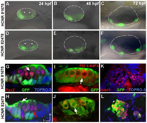 Figure 2. Spatial-temporal expression pattern of pou3f4 enhancers in the inner ear.(A–F) Lateral views of inner ears from zebrafish transgenic embryos for HCNR 81675 (A–C) and HCNR 82478 (D–F) enhancers analysed from 24 hpf to 72 hpf. In HCNR 81675 embryos at 24 hpf, GFP is observed in two broad domains comprising the sensory territories as observed by the otolith deposition (stars) (B). In HCNR 82478, GFP is already restricted to the anterior and posterior sensory macula from its onset as observed by GFP fluorescence relative to the otolith position (star). (C and F) GFP is found in the three sensory crista in 3-day old embryos in both transgenic zebrafish lines. Orientation is anterior (left) and dorsal (up). (G and H) Confocal transverse images of inner ear sensory patches immunostained with the anti-Pax2 antibody in 72 hpf embryos. In HCNR 81675 embryos, GFP is found in supporting cells but absent in hair-cells (Pax2 positive cells; pointed by a white arrow) (G). In contrast, HCNR 82478 embryos displayed GFP in supporting cells but also in hair-cells at lower levels (white arrow) whereas other hair-cells where completely devoid of GFP expression (red arrow). (I and J) Transverse confocal images of sensory patches of both enhancer embryos immunostained for GFP after the injection of the hair cell specific labelling marker FM 4-64FX. The same result was obtained in this experiment. (I) GFP is devoid in FM 4-64FX stained hair-cells in HCNR 81675 embryos (white arrow), whereas some hair-cells displayed GFP in HCNR 82478 embryos (J; white arrow). (K and L) Confocal images taken from the transverse section anterior to the first section from the otic vesicle. Co-immunostaining for anti-GFP and anti-islet1 protein reveals that only in HCNR 82478 transgenic embryos GFP is activated in the otic ganglion (L). (G–L) Lateral (left) and dorsal (up).