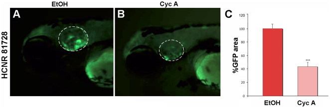 Figure 4. The POU3F4 HCNR 81728 enhancer is regulated by Hedgehog signaling.(A and B) Lateral view of GFP otic expression in 96 hpf embryos transgenic for the HCNR 81728 enhancer in control (A) and Cyclopamine A treated embryos (B). (C) Percentage of GFP expressing area in otic vesicles from 95% EtOH and Cyclopamine A treated embryos.