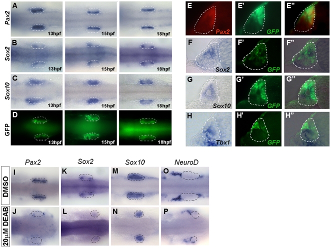 Figure 5. Co-localization of Pax2 and Sox2 with GFP driven by the HCNR 81675 enhancer.(A–D) Dorsal view of transgenic embryos assayed by ISH for the expression of pax2a (A), sox2 (B), sox10 (C) at 13, 15 and 18 hpf. GFP (D) displays a similar pattern than sox2 and pax2a at 15 hpf (compare A and B with D). Orientation is anterior to the left. (E–E″) Double immunostaining with anti-Pax2 (E) and anti-GFP antibody (E′) in transverse sections of 15 hpf otic vesicles revealed co-localization of both proteins (E″). (F–F″) GFP protein (F′) also co-localizes with sox2 mRNA (F″) but not sox10 or tbx1 mRNA (G″ and H″). (I–P) pax2a and sox2 expression is abolished in retinoic acid treated HCNR 81675 embryos (compare J and L to I and K, respectively) but not other genes such as sox10 or neuroD (compare N and P to M and O, respectively). Dorsal view, orientation is anterior to the left.