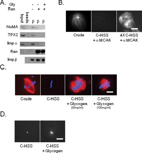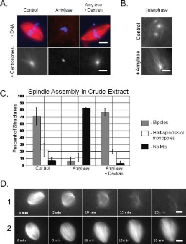 The assembly of microtubules during mitosis requires many identified components, such as γ-tubulin ring complex (γ-TuRC), components of the Ran pathway (e.g., TPX2, HuRP, and Rae1), and XMAP215/chTOG. However, it is far from clear how these factors function together or whether more factors exist. In this study, we used biochemistry to attempt to identify active microtubule nucleation protein complexes from Xenopus meiotic egg extracts. Unexpectedly, we found both microtubule assembly and bipolar spindle assembly required glycogen, which acted both as a crowding agent and as metabolic source glucose. By also reconstituting microtubule assembly in clarified extracts, we showed microtubule assembly does not require ribosomes, mitochondria, or membranes. Our clarified extracts will provide a powerful tool for activity-based biochemical fractionations for microtubule assembly.