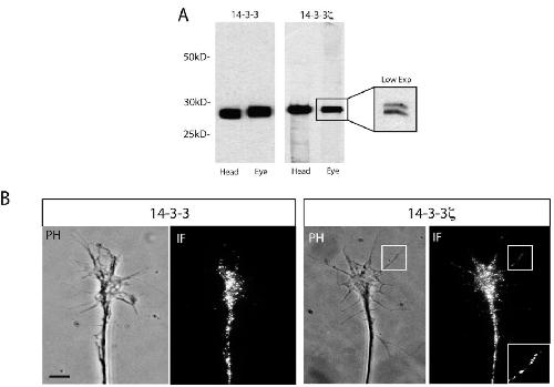 Figure 2 14-3-3/14-3-3Ï proteins are expressed in retinal growth cones. (A) Western blot of head or eye lysates using 14-3-3 or 14-3-3Ï antibodies. The 14-3-3Ï antibody recognizes both the unphosphorylated and the phosphorylated form of 14-3-3Ï at a predicted molecular weight of * 29 kD (R1), which is more apparently visualized at low exposures (inset). (B) Immunofluorescence staining of retinal growth cones using 14-3-3 or 14-3-3Ï antibodies. The area marked by square shows localization of 14-3-3Ï within filopodia. A magnified view of the squared area is shown in the inset (scale bar = 5 μm).