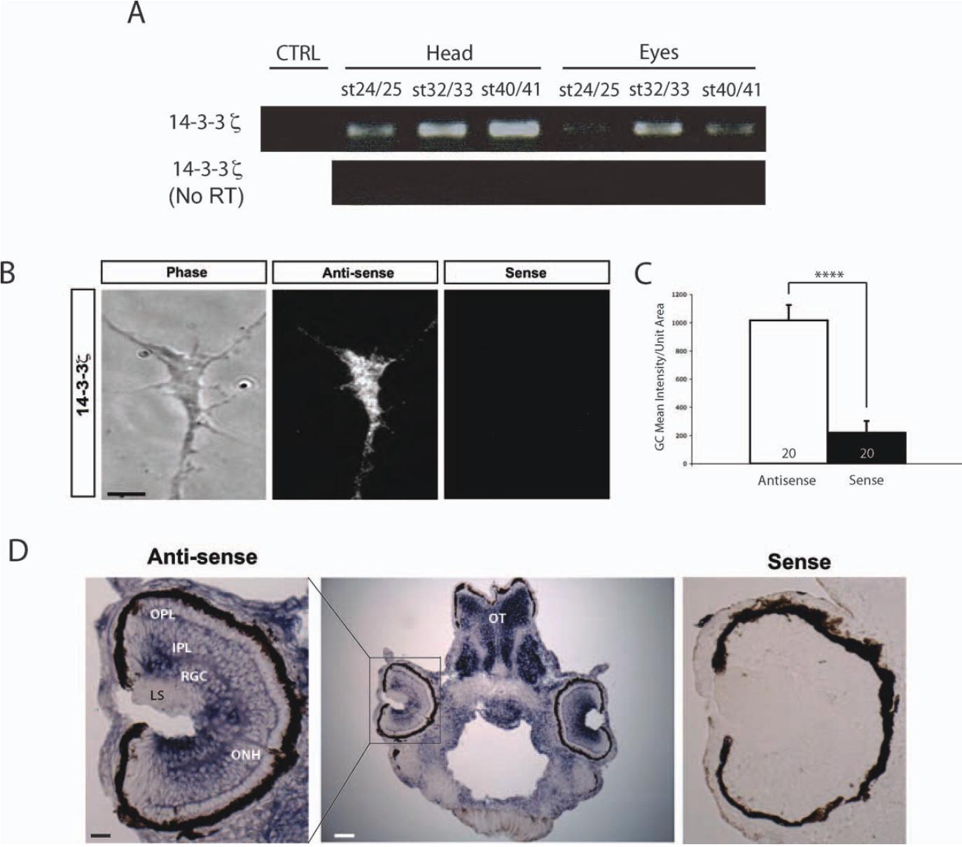 Figure 1 Localization of 14-3-3Ï mRNA in retinal axons and growth cones. (A) RT-PCR of mRNAs purified from heads and eyes of various stages. RT only control was performed to rule out genomic contaminations. (B) Representative images of FISH with either anti-sense or sense probes (scale bar = 5 μm) (R1). (C) Quantification of FISH mean intensity per unit area (n = no. of growth cones; **** = p<0.0001; MannâWhitney). (D) In situ hybridization of stage 40 embryo sections (ONH = optic nervehead, LS = lens, RGC = retinal ganglion cells, IPL = inner plexiform layer, OPL = outer plexiform layer, OT = optic tectum; scale bars = 25 μm for left panel and 100 μm for the middle panel).