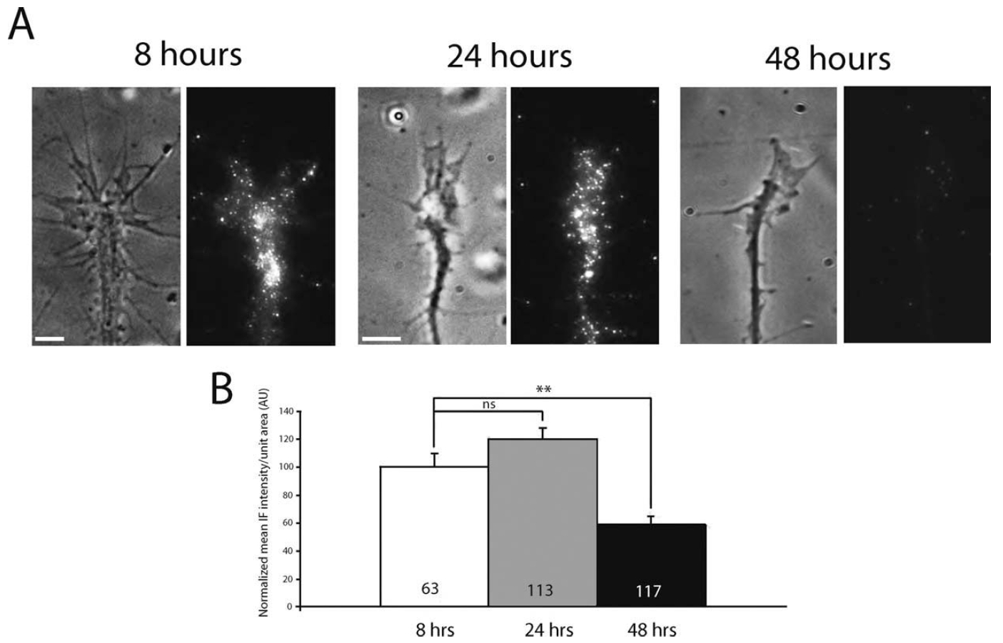 Figure 3 The level of 14-3-3ς in growth cones decreases with age. (A) Representative 14-3-3ς IF staining in growth cones cultured for 8, 24, and 48 h (scale bars = 5 μm). (B) Quantitation of mean 14-3-3ς IF intensity/unit area in growth cones cultured 8, 24, 48 h (n = no. of growth cones; three replicates; ** = p<0.01; one-way ANOVA with Bonferroni post-test).