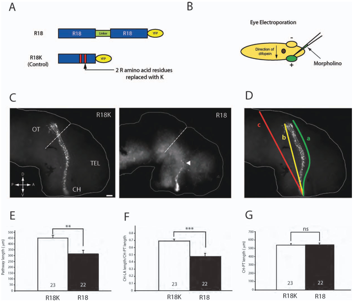 Figure 4 Inhibition of 14-3-3/14-3-3Ï shortens retinal axonprojection in vivo. (A) Schematics of R18 and R18K constructs tagged with YFP. (B) Schematics of eye electroporation. FITC-tagged morpholinos are electroporated into the eye at stage 26. (C) Dissected brains from stage 40 embryos that have been electroporated with either R18-YFP or R18K-YFP. The arrowhead indicates markedly shorter axons found in R18-YFP transfected brains (dashed line = anterior tectal border; scale bar = 50 μm; CH = optic chiasm; TEL = telencephalon; OT = optic tectum). (D) The length of the pathway was measured in two ways: (1) following the curvature of the pathway (a) and (2) measuring the shortest distance from the optic chiasm to the longest axon (LA; b) divided by the shortest distance from the chiasm to the posteriortectum (PT; c). (E) Measurement of the pathway length (equivalent to \a" in Fig. 4D). (F) Measurement of CH to LA length/CH to PT length (equivalent to \b/c" in Fig 4.4). (G) Measurement of CH to PT length to rule out significant differences in brain size. (Note: in E, F, and G, n = number of brains analyzed; three replicates; **p<0.01; ***p<0.001; unpaired t-test).