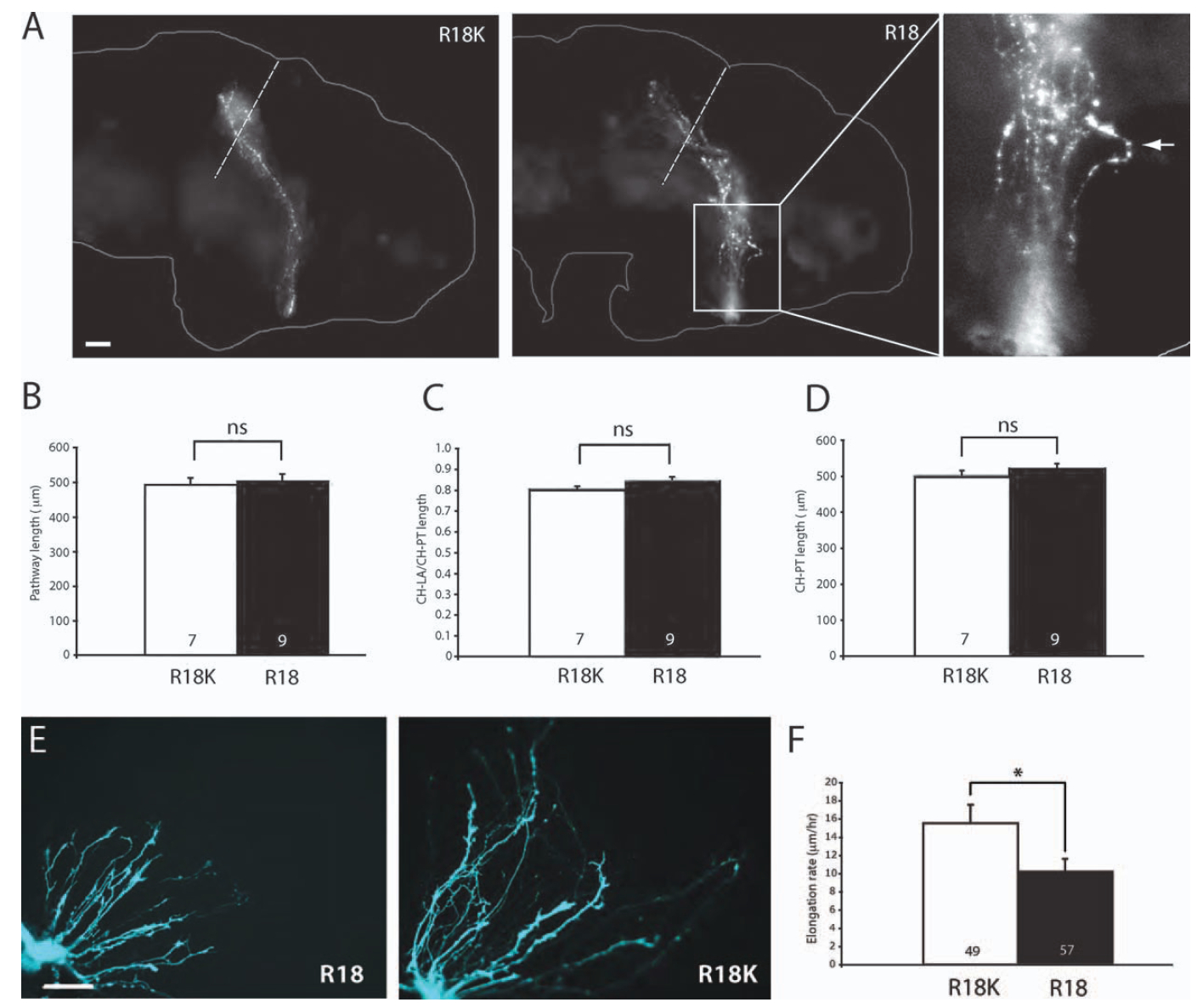 Figure 5 Shortened retinal projection due to retarded axon elongation rate. (A) Brains of stage 43 embryos that have been eye-electroporated with R18-YFP or R18K-YFP (R1). Axons reach the tectum even in those that were electroporated with R18-YFP. The rightmost panel represents the magnified view of the R18 pathway with an axon taking an unusually tortuous path (arrowhead; dashed line = anterior tectal border; scale bar = 50 μm). (B) Measurement of the pathway length. (C) Distance from CH-LA/CH-PT. (D) Distance from CH-PT (For B, C, D, n = no. of brains analyzed; unpaired t-test). (E) Whole eye culture of eyes that have been electroporated with R18-YFP or R18K-YFP (scale bar = 50 μm). (F) The elongation rate of axons transfected with R18-YFP or R18K-YFP (n = no. of growth cones; *p<0.05; MannâWhitney).