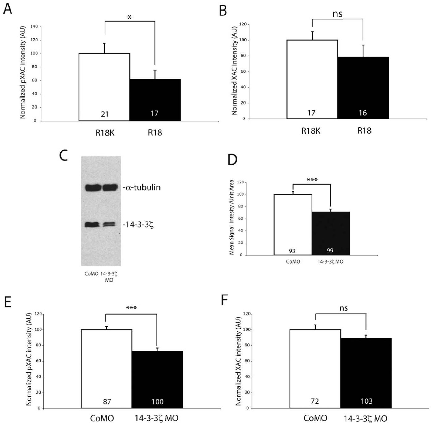 Figure 7 14-3-3/14-3-3Ï knockdown decreases phospho-XAC in retinal growth cones. (A, B) QIF analysis of pXAC (A) and XAC (B) in growth cones transfected with either R18K- or R18-YFP (n = no. of growth cones; four replicates; *p<0.05; MannâWhitney). (C) Western blot of eye lysates showing 14-3-3Ï knockdown with the antisense morpholino. a-Tubulin was used as a loading control. (D) QIF analysis of 14-3-3Ï in growth cones injected with either control or 14-3-3Ï morpholino (*** p<0.001; n = no. of growth cones; three replicates; unpaired t-test). (E, F) QIF analysis of pXAC (E) and XAC (F) in growth cones injected with control or 14-3-3Ï morpholino (n = no of growth cones; *** p<0.001; three replicates; unpaired t-test).