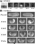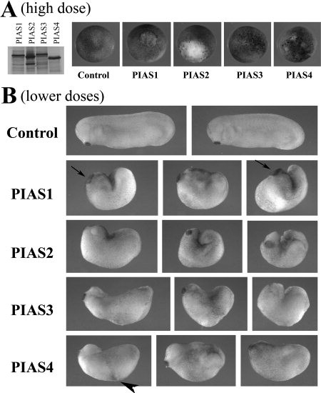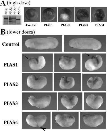 Figure 3. Ectopic expression of PIAS genes in early frog embryos disrupts Xenopus development. A: In vitro translation showed that all PIAS proteins were synthesized efficiently from their cognate RNAs. When RNAs were injected at high doses (2 ng), PIAS1, 2, and 4 induced severe lesions in embryos at early gastrula stages and embryonic lethality before tailbud stages. PIAS3 was less effective in inducing the lesions. B: When the doses of the RNAs were adjusted to allow embryo survival (shown here were embryos injected with RNAs of 1 ng PIAS1, 0.5 ng PIAS2, 2 ng PIAS3, and 1 ng PIAS4), the resulting tailbud embryos showed failure in blastopore closure, shortened body axis, and defective head formation. The embryos with ectopic PIAS1 often displayed enlarged cement gland (arrows), and the embryos with elevated PIAS4 sometimes formed pigmented aggregates at the flank (arrowhead).Download figure to PowerPoint