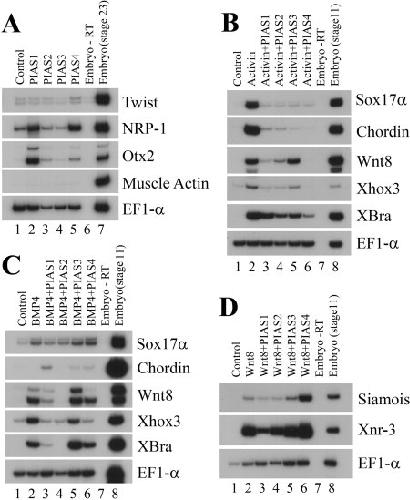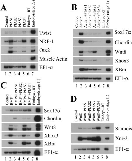 Figure 5. PIAS genes differentially regulate signals from various growth factors. A: PIAS induced the neural markers with different efficiency, but none induced the expression of the mesodermal marker muscle actin. B: PIAS inhibited mesodermal induction by activin. C: PIAS blocked mesoderm induction by BMP4 with different effectiveness. D: PIAS1 reduced marker induction by Wnt8, but the other PIAS genes were ineffective; and PIAS4 enhanced, rather than inhibited, induction of the direct targets of Wnt signaling. The doses of the RNAs used in the experiments were: 1 ng PIAS1, 0.5 ng PIAS2, 2 ng PIAS3, 1 ng PIAS4; 2 pg activin, 20 pg BMP4, and 100 pg Wnt8.Download figure to PowerPoint