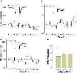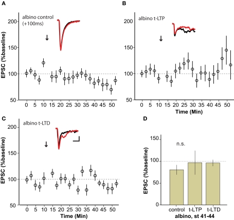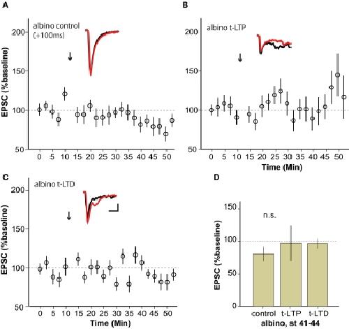 Figure 5. Albino Xenopus tadpoles do not exhibit reliable STDP during the sensitive period. (A–C) Average of experiments to induce t-LTP (n = 4) (B) and t-LTD (n = 4) (C) using the protocols that succeeded in wild type animals, applied to stage 41–44 albino tadpoles. No STDP was reliably generated using the classic STDP protocol in albinos.