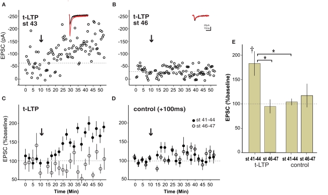 Figure 2. Spike timing-dependent LTP is limited to a sensitive period ending around stage 45 in wild type tadpoles. (A) Experiment in a stage 43tadpole in with t-LTP was induced (arrow) using a 5â10âms preà post pairing interval. Inset shows averaged EPSC before (black) and 20â30âmin after (red) t-LTP induction. (B) Example from stage 46 animal lacking t-LTP. (C) Averages of t-LTP induction experiments in stage 41â44 (filled circles, n =â4) and stage 46â47 (open circles, n =â4) tadpoles. (D) Control (100-ms interval) pairing did not induce reliable STDP at any age (stage 41â44, n =â7; stage 46â47, n =â5). (E) Graph summarizing t-LTP experiments by age. â p < 0.05 one-sample t-test (0â10 vs. 30â40âmin), *p < 0.05 ANOVA with Bonferroni post-test.