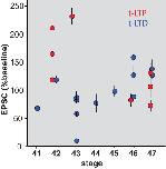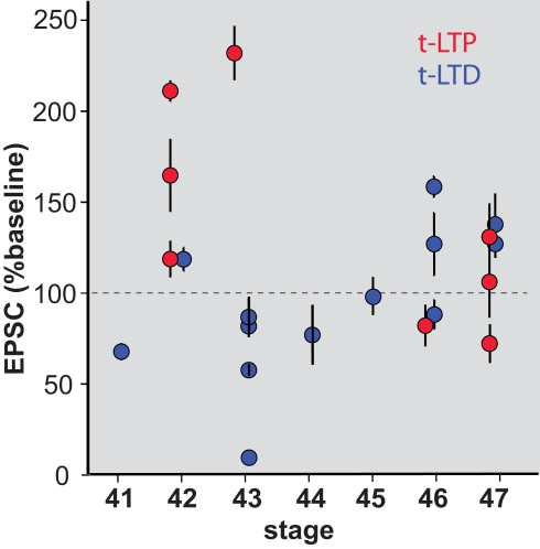 Figure 4. Scatterplot showing STDP efficacy as a function of developmental stage. Mean EPSC amplitude measured at 20–30 min after induction, normalized to baseline amplitude during the 10 min immediately prior to induction.