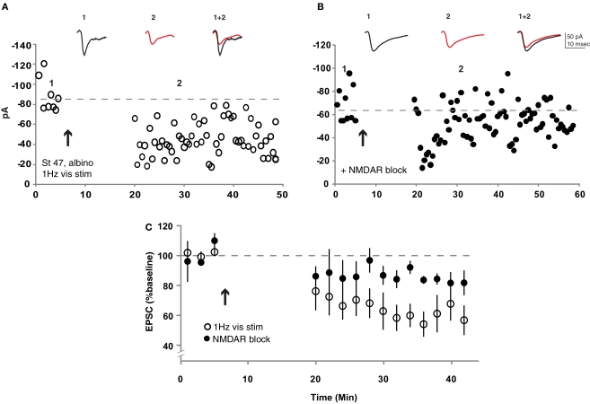 Figure 6. Repeated low-frequency visual stimulation induced LTD in albino stage 47 tadpoles. (A) Repeatedly flashing an array of LEDs at 1 Hz for 15 min induced retinotectal synaptic depression. (B) This visual stimulation induced LTD was largely blocked in the presence of CPP (40 mM). (C) Average of all experiments with (filled circles, n = 4) and without (open circles, n = 9) NMDARs pharmacologically blocked. p < 0.001 Student's t-test.