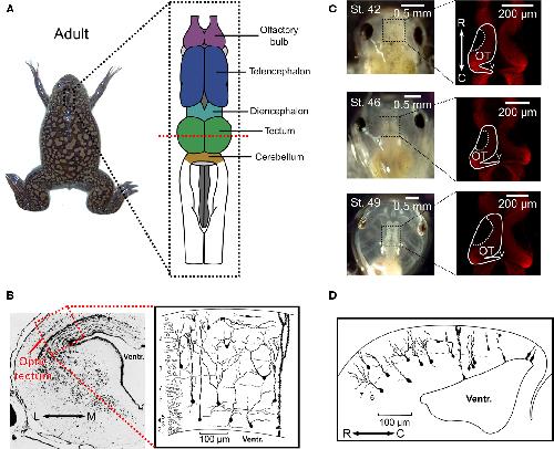 Figure 1. Anatomy of the optic tectum in the adult Xenopus laevis and during tadpole development. (A) In the adult Xenopus laevis frog (photograph) the central nervous system (drawing) contains several distinct structures and the optic tectum is the roof of the large midbrain structure, situated caudally to the diencephalon and rostrally to the cerebellum. It is one of the largest dorsal structures in the Xenopus brain, along with the telencephalon and the olfactory bulb. (B) The layered structure of the adult optic tectum can be seen in the coronal section (left), which has been stained with cresyl-violet. The section is taken from the plane indicated by the red dashed line in (A). As the drawing illustrates (right), there are several distinct cellular morphologies found within the optic tectum, which have been classified into 14 categories. The numbers at the side of the drawing indicate the 9 different layers of the tectum. (C) Photographs (left) of Xenopus laevis tadpoles taken dorsally at stages 42, 46, and 49 illustrate the changes that occur during the stages in which STDP is typically studied. During this time the optic tectum grows, as shown by confocal images of whole-mount brains with propidium iodide staining for cell nuclei. The images shown are in the horizontal plane and at a depth of 100 μm from the dorsal surface of the brain (right). Note the dark regions in the rostral�lateral optic tectum which are comprised mostly of neuropil. Neurogenesis takes place in the caudal�medial region surrounding the ventricle. (D) Due to the location of the neurogenerative zone there is a progression in the maturity and morphological complexity of cells in the optic tectum at these ages in the caudal�rostral axis, as shown by this camera lucida drawing of a sagittal slice from a stage 49 tadpole. Images in (B) and (D) are reproduced with permission from L�z�r (1973) and Nikundiwe and Nieuwenhuys (1983). - See more at: http://journal.frontiersin.org/Journal/10.3389/fnsyn.2010.00007/full#sthash.iocnGBhs.dpuf |