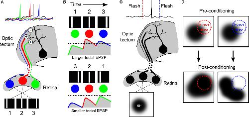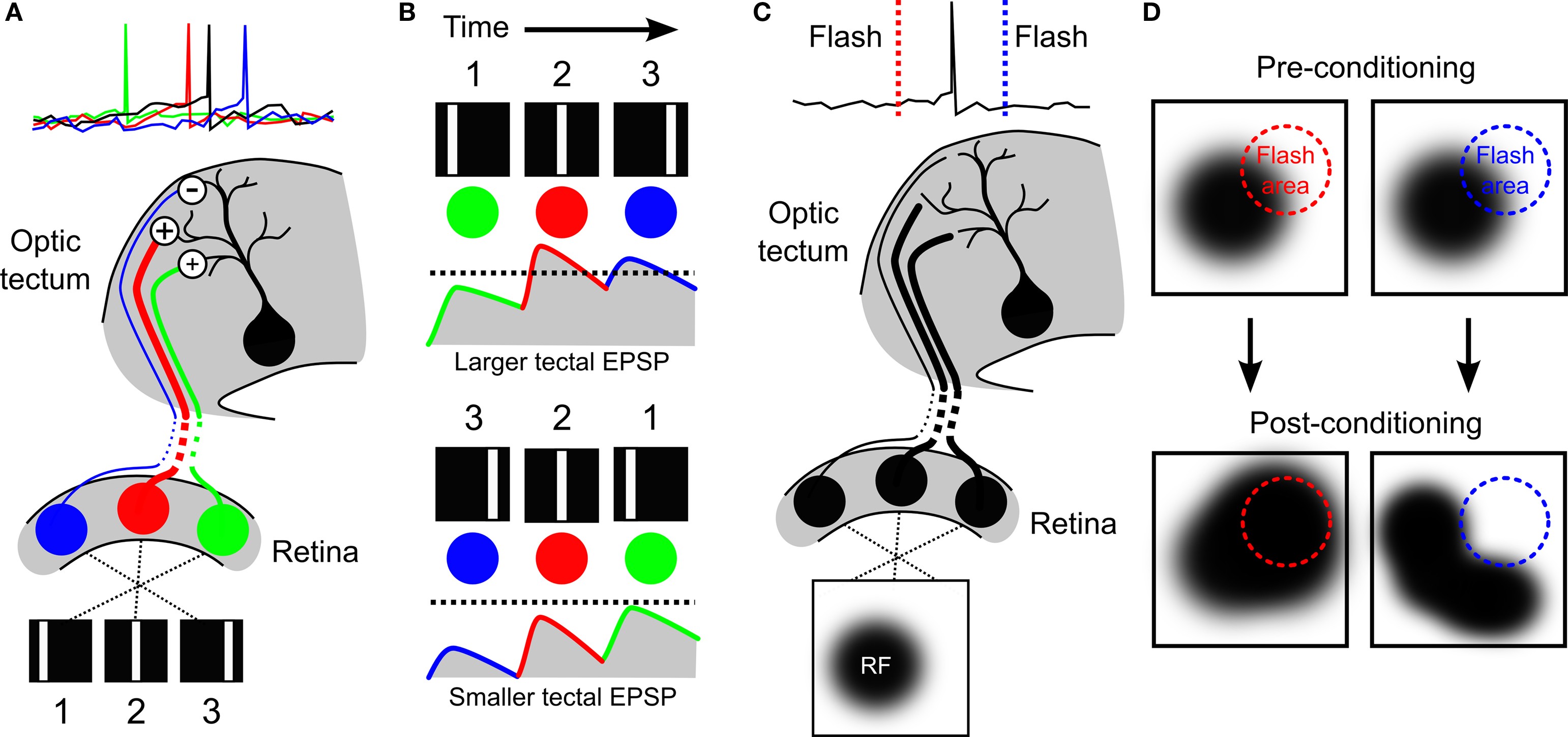 Figure 3. Development of direction selectivity and RF structure via STDP in the optic tectum. (A) The principle of how STDP can induce direction selectivity in the optic tectum was demonstrated by Mu and Poo (2006) , by mimicking movement across the retina with flashes of a white bar at three different locations in visual space. If the tectal cell (black) was forced to spike soon after the second flash, the RF of the cell was altered by STDP in an asymmetric manner that potentiated responses to the first and second bars (green and red cells), but depressed responses to the third bar (blue cell). (B) Asymmetric changes in a RF can produce direction selectivity due to the differences in temporal summation for one direction versus the other. If the strengthened inputs are activated first, they can summate with subsequent inputs to produce a high level of depolarization in postsynaptic tectal cells producing suprathreshold activity (top, dashed line indicates hypothetical spike threshold). In contrast, if the weaker inputs are stimulated first, they will have decayed by the time subsequent inputs arrive and so less temporal summation occurs and inputs remain subthreshold (bottom). (C) The strength of the connections onto a tectal neuron determines its RF profile, as illustrated here for a hypothetical cell. (D) Vislay-Meltzer et al. (2006) demonstrated that this RF profile could be altered by STDP to either move towards or away from a given region of space. If a flash occurred prior to a tectal cell�s spikes (red line), the RF tended to shift toward that area. In contrast, if a flash occurred after a tectal cell�s spikes (blue line) the RF tended to shift away from the area of the flash. Interestingly, they also observed that the RFs potentiated in areas outside of the area of the flash, as shown. - See more at: http://journal.frontiersin.org/Journal/10.3389/fnsyn.2010.00007/full#sthash.iocnGBhs.dpuf |