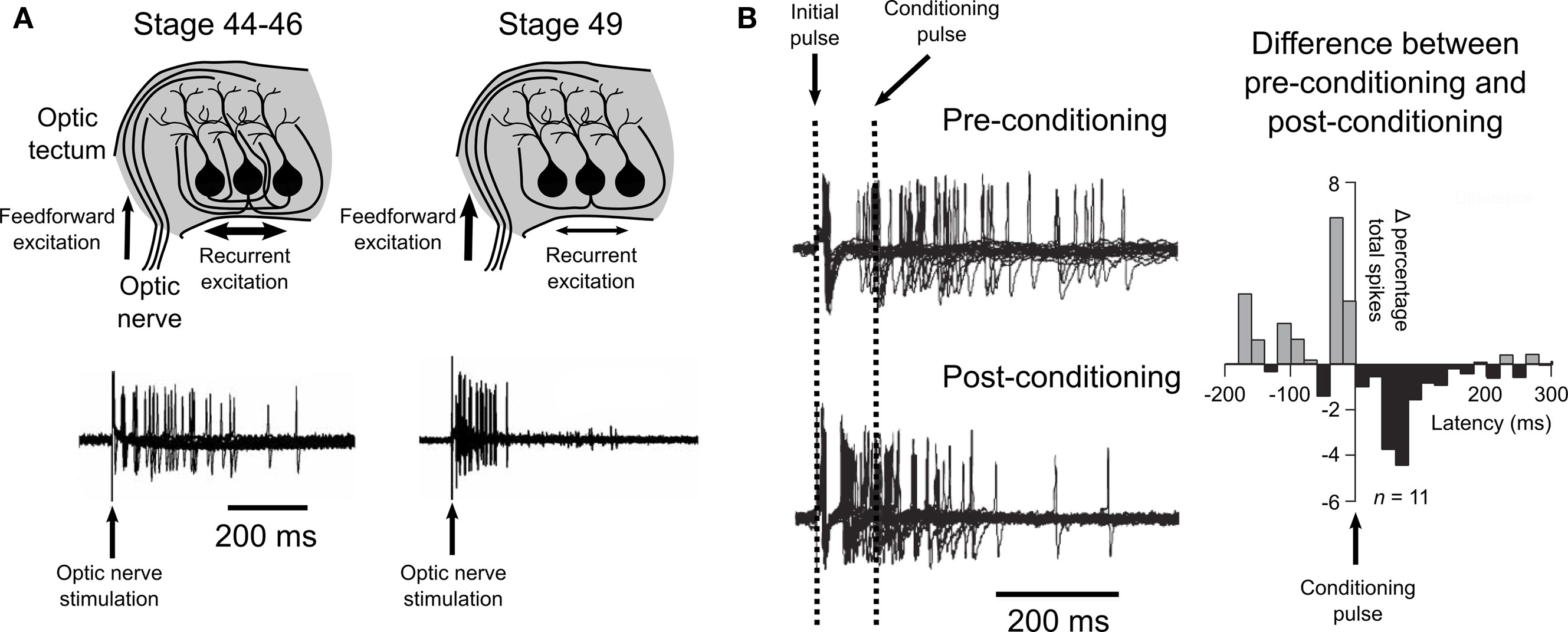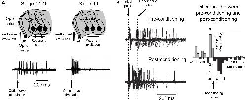 Figure 4.Spike-timing-dependent plasticity and recurrent excitatory circuits in the optic tectum. (A) Pratt et al. (2008) observed evidence for a developmental refinement of the recurrent excitatory circuitry of the tectum between stages 44 and 49. Stimulation of the optic nerve at early stages (44�46) produced prolonged spiking activity, while stimulation at a later stage (49) produced an initial strong response that did not show prolonged activity, as illustrated by traces from loose-patch recordings shown here. (B) Training young tectum by delivering a timed �conditioning� pulse to the optic nerve induced a similar reshaping of spiking to that observed over development. Examination of the differences in the percentage of spikes that occurred before or after the conditioning pulse showed an effect that supported a role for STDP in this refinement of recurrent circuitry. Data are reproduced from Pratt et al. (2008) . - See more at: http://journal.frontiersin.org/Journal/10.3389/fnsyn.2010.00007/full#sthash.iocnGBhs.dpuf |