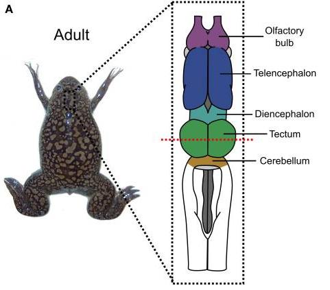 In the adult Xenopus laevis frog the central nervous system (drawing) contains several distinct structures and the optic tectum is the roof of the large midbrain structure, situated caudally to the diencephalon and rostrally to the cerebellum. It is one of the largest dorsal structures in the Xenopus brain, along with the telencephalon and the olfactory bulb. |