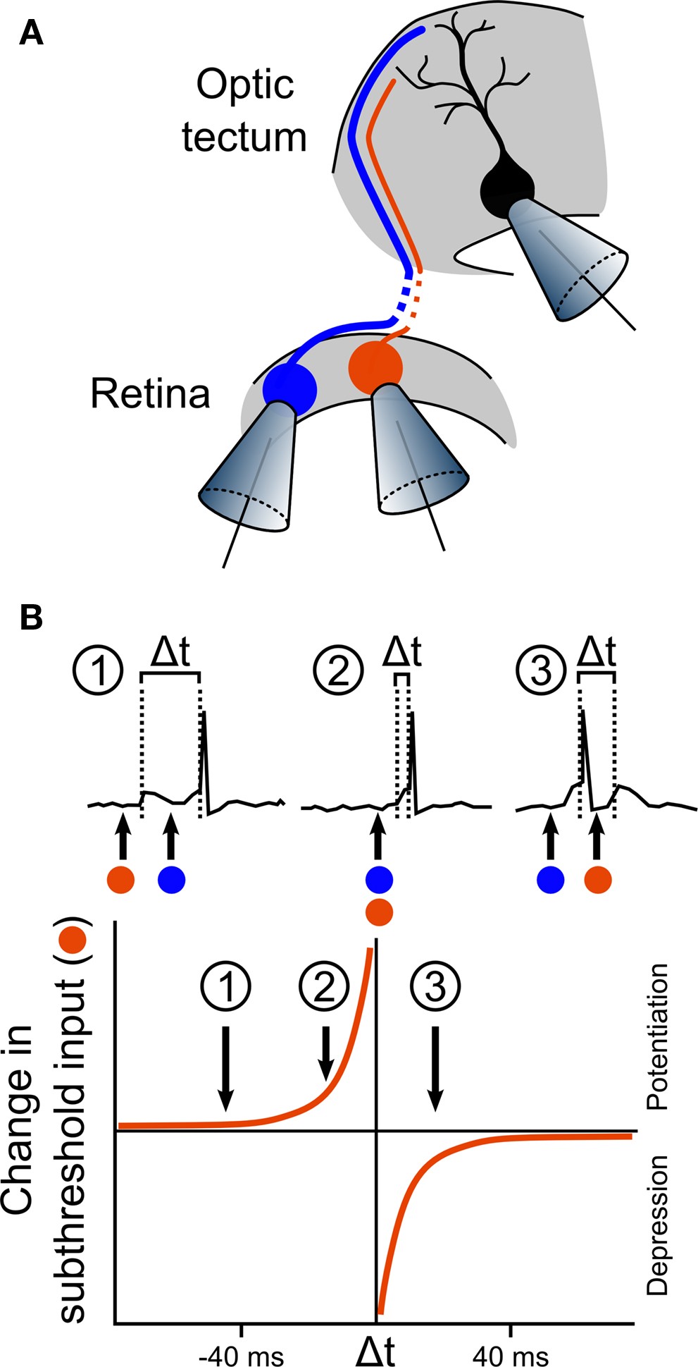 Figure 2. First in vivo observation of STDP in the optic tectum. (A) The first in vivo demonstration of STDP was performed by Zhang et al. (1998) in an elegant experiment, illustrated here. Activity from a single tectal neuron was recorded using whole-cell perforated patch, while two different RGCs that form synaptic connections onto the tectal neuron were loose-patched, allowing stimulation for induction of LTP or LTD. In some of the recordings, one RGC produced suprathreshold responses (illustrated by the blue cell), whilst the other produced only subthreshold responses (illustrated by the orange cell). (B) Analysis of the effects of the timing of the inputs showed that the effect of stimulation on the subthreshold input depended on the timing of its excitatory postsynaptic potentials (EPSPs) relative to the tectal spike that was triggered by the suprathreshold input. If the subthreshold EPSP preceded the tectal spike by more than 20 ms, the input was relatively unaffected (inset 1). However, if the subthreshold EPSP occurred within the 20 ms before the suprathreshold EPSP, and therefore just before the tectal spike, the input was strongly potentiated (inset 2). In stark contrast, if the subthreshold EPSP occurred during the 20 ms immediately following the tectal cell spike, this input was depressed (inset 3). Examination of the effects of a range of timing differences led to an estimated curve for the STDP rule in retinotectal synapses. - See more at: http://journal.frontiersin.org/Journal/10.3389/fnsyn.2010.00007/full#sthash.iocnGBhs.dpuf |