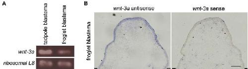 Figure 1. Wnt-3a is expressed in the blastema of both froglets and tadpoles. (A) RT-PCR of the total RNA from tadpole blastemas at 5 dpa or froglet blastemas at 9 dpa showed that wnt-3a was expressed in both the tadpole and froglet blastemas. (B) In situ hybridization of froglet blastemas