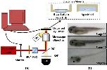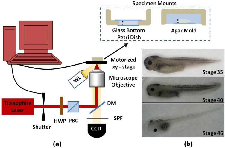 Fig. 1. Schematic of femtosecond laser ablation of Xenopus tadpoles. (a) Femtosecond pulses were focused onto the specimens mounted on top of the motorized stage. For laser ablation, Xenopus laevis younger than stage 40 were held between a Petri dish with a glass welled bottom and a cover slip, while older tadpoles were placed inside a depression made of agar, secured with a glass cover slip, and then inverted for placement on the stage. (HWP—half wave plate, PBC—polarizing beam cube, SPF—short pass filter, DM—dichroic mirror, WL—white light source) (b) Images of Xenopus tadpoles at three different developmental stages.